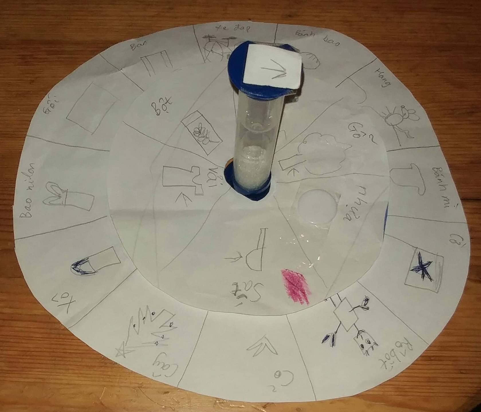 Các vòng tròn nên được làm bằng nhựa (hoặc giấy bìa cứng) và được đặt nằm ngang trên bàn để giáo viên và trẻ em có thể dễ dàng thay đổi các hình ảnh trong các phần vòng tròn. Các hình ảnh sẽ được dán lên bằng băng dính.